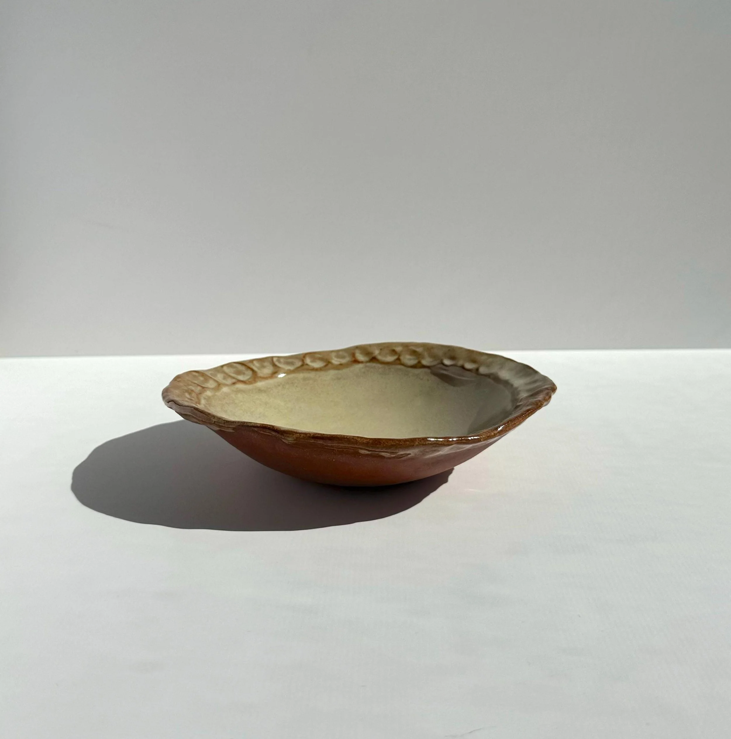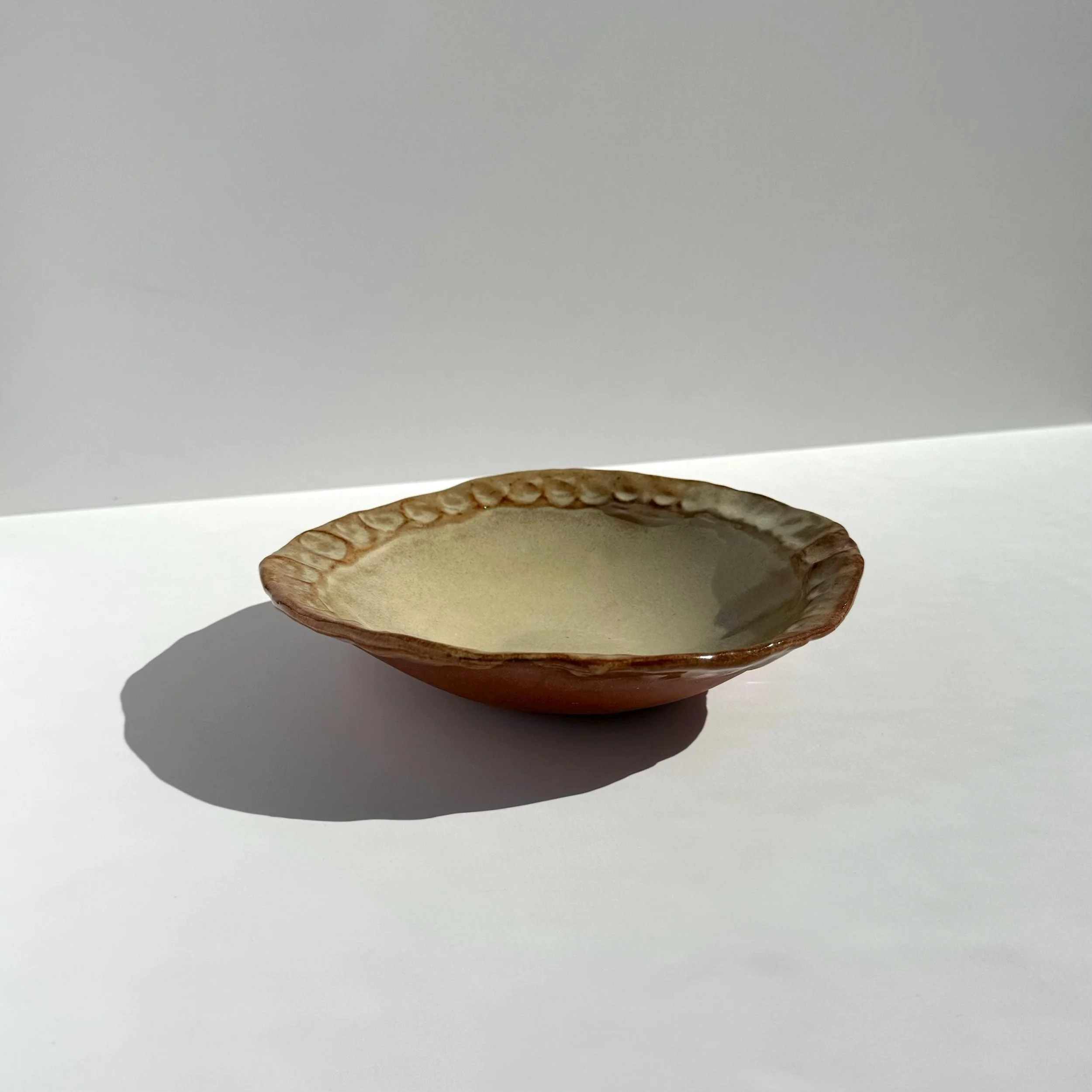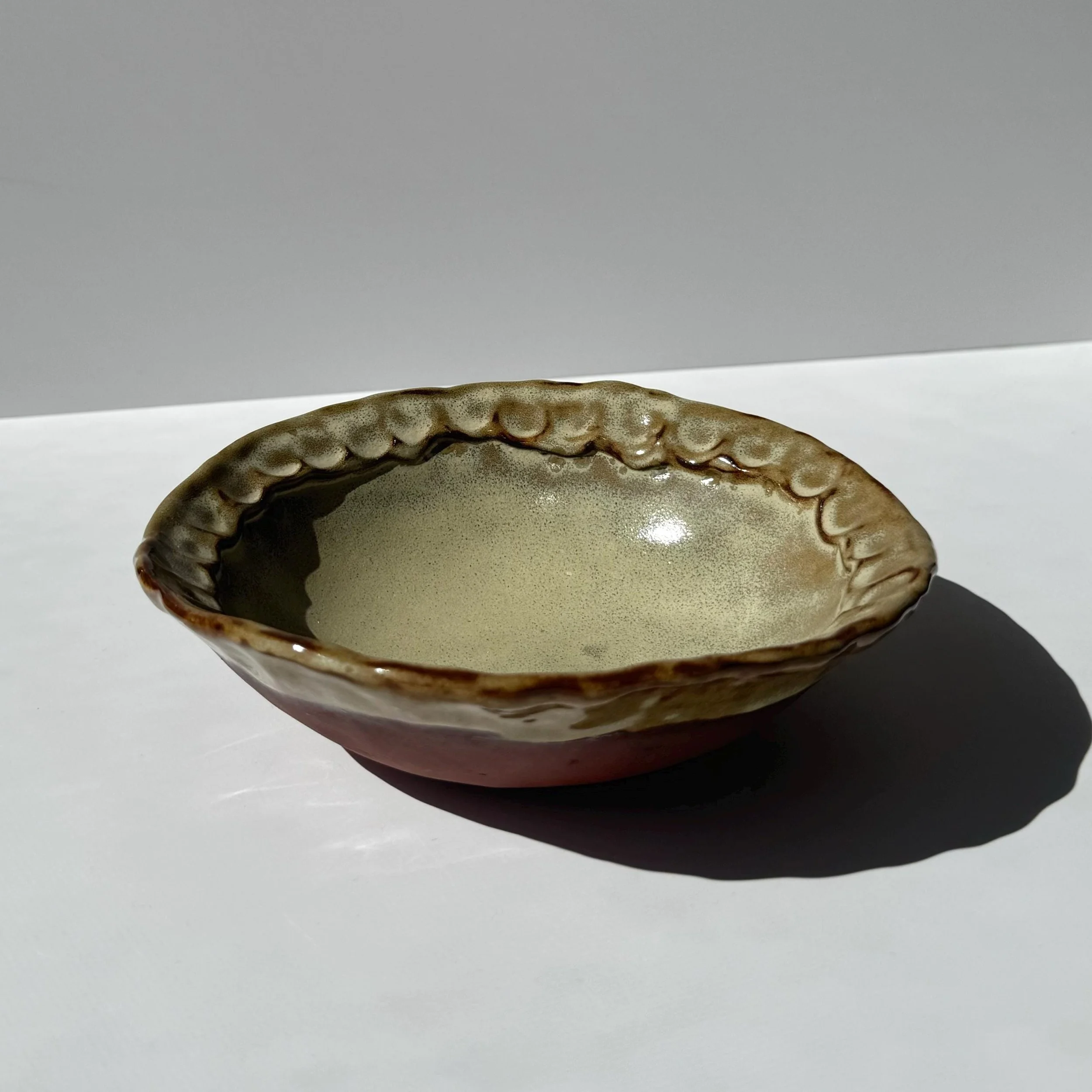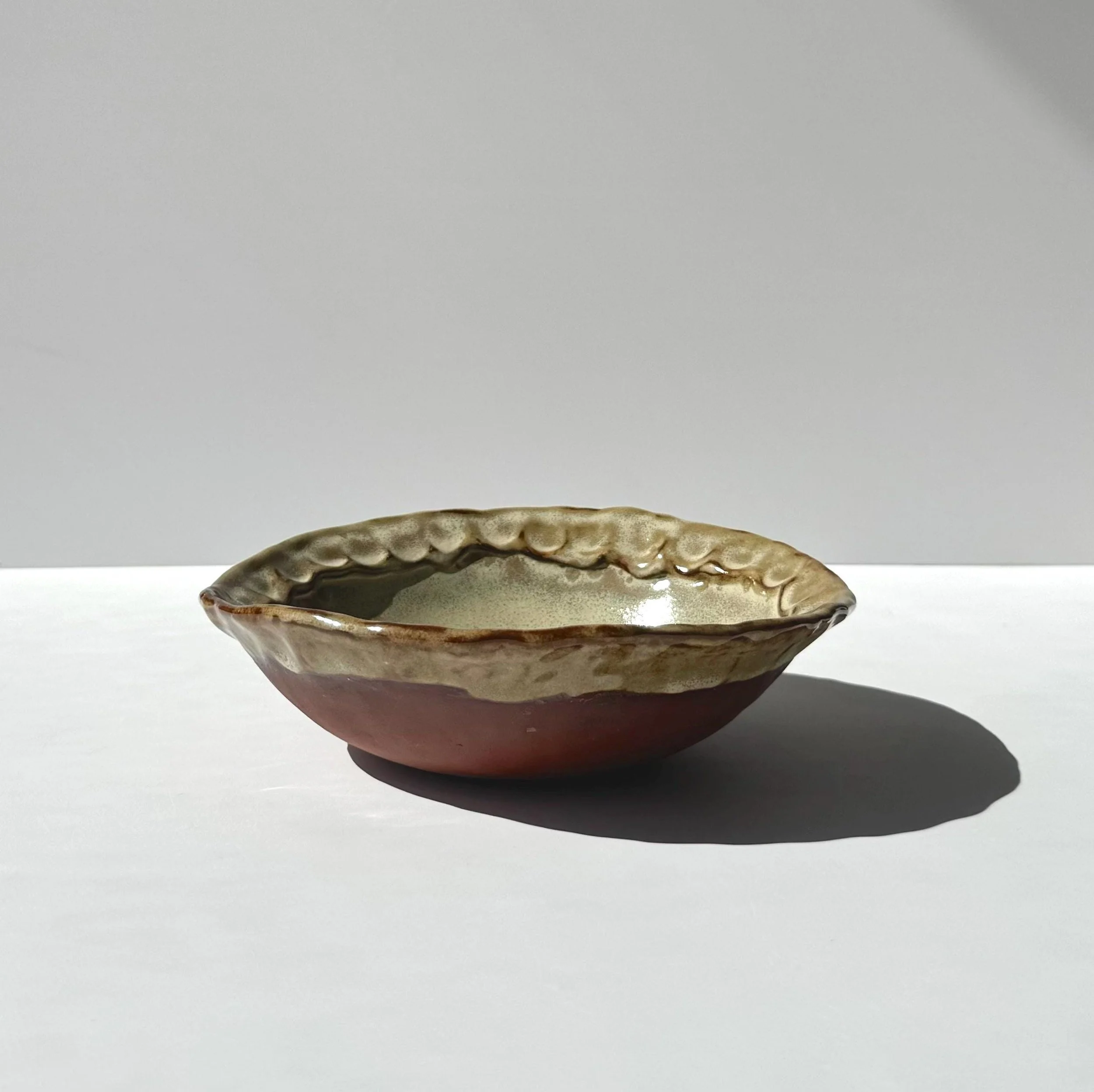 Hand-thrown, white stoneware with a hand-carved, tricolor glazed rim