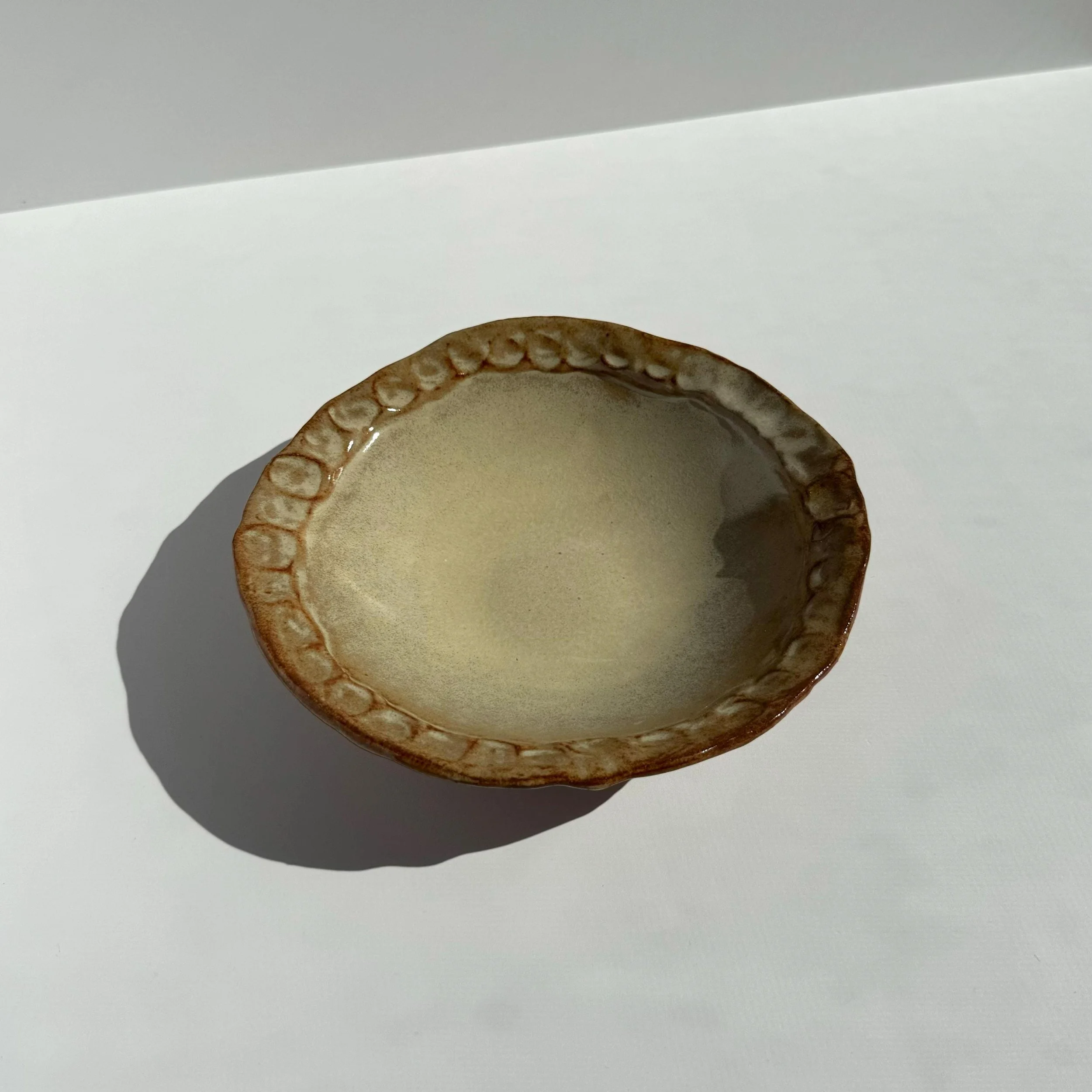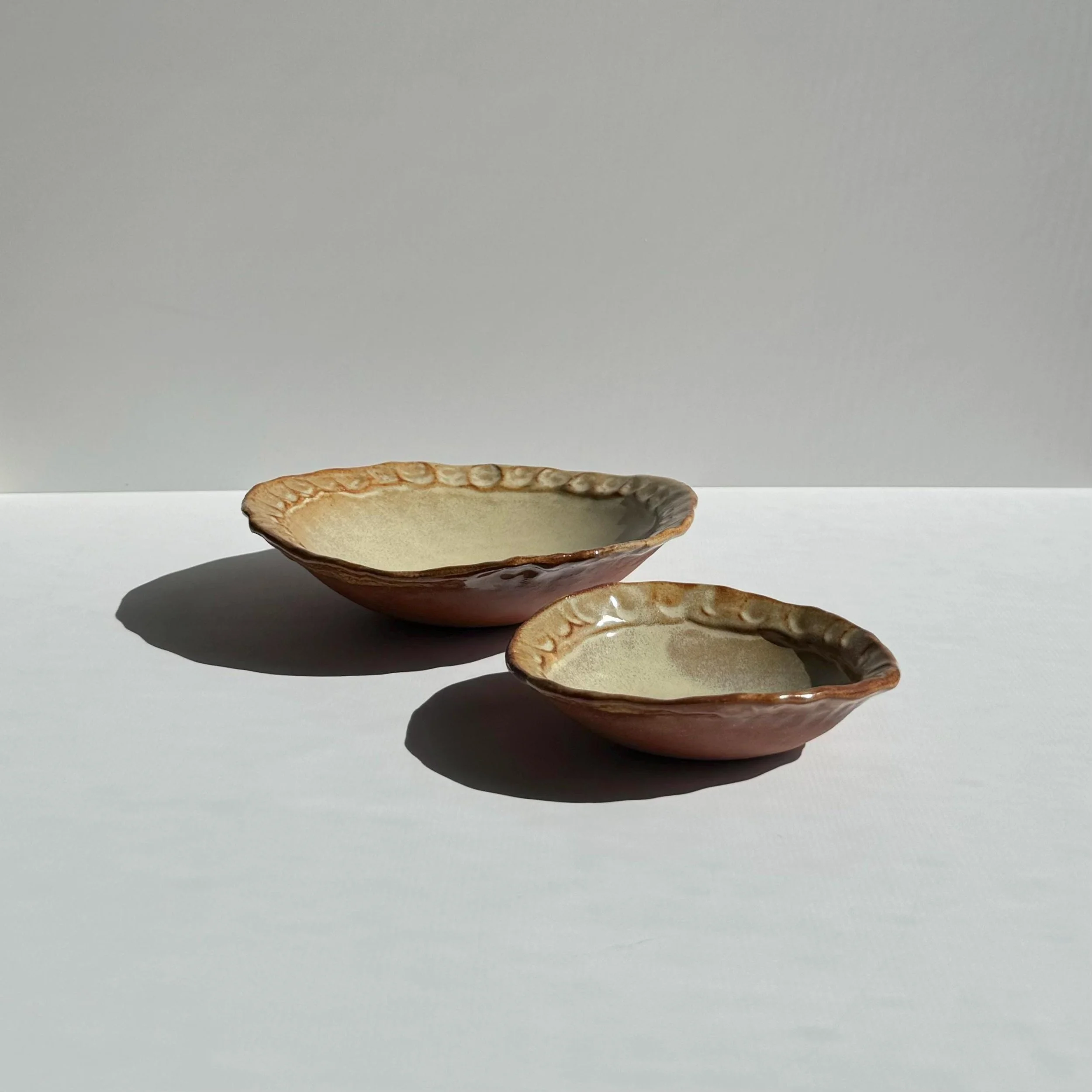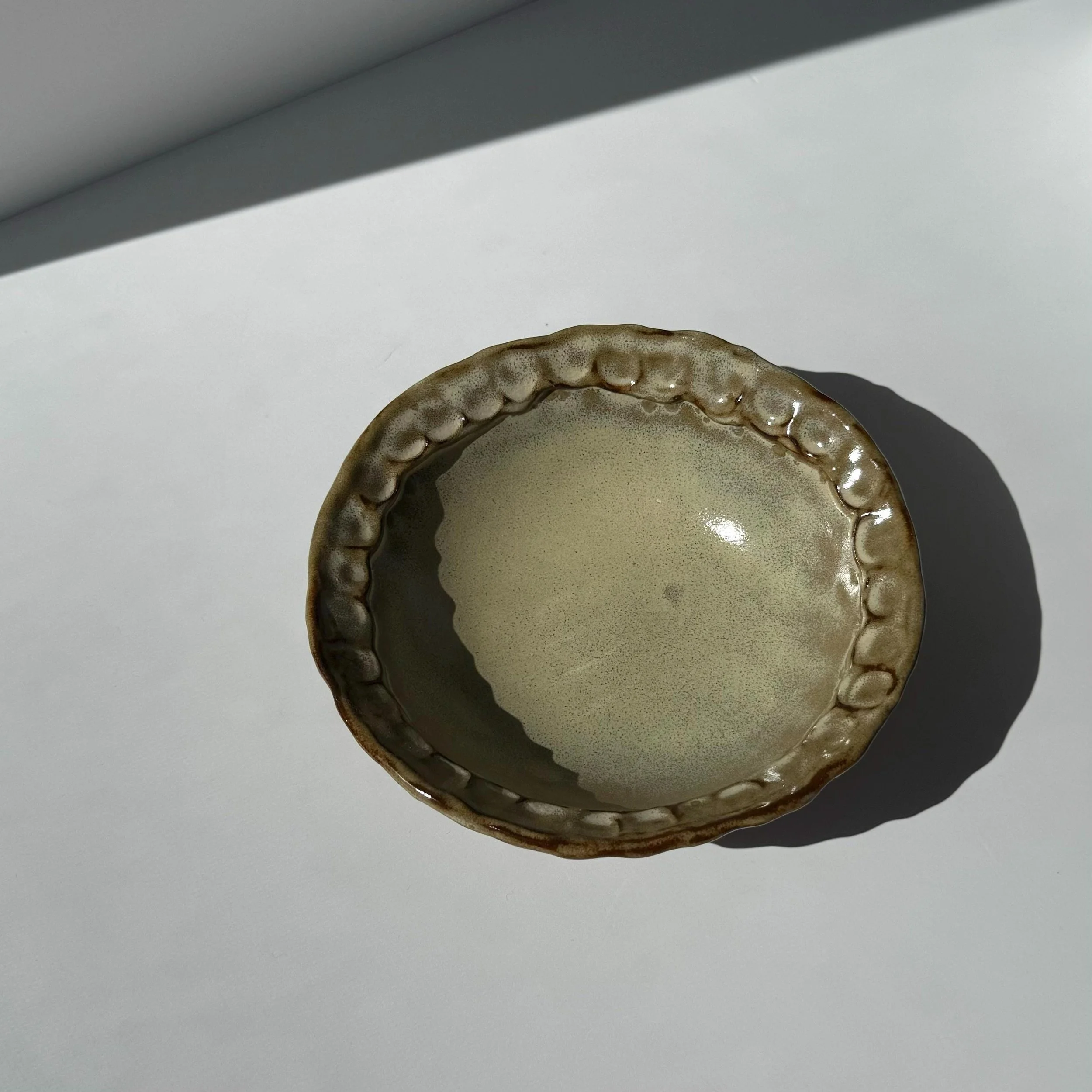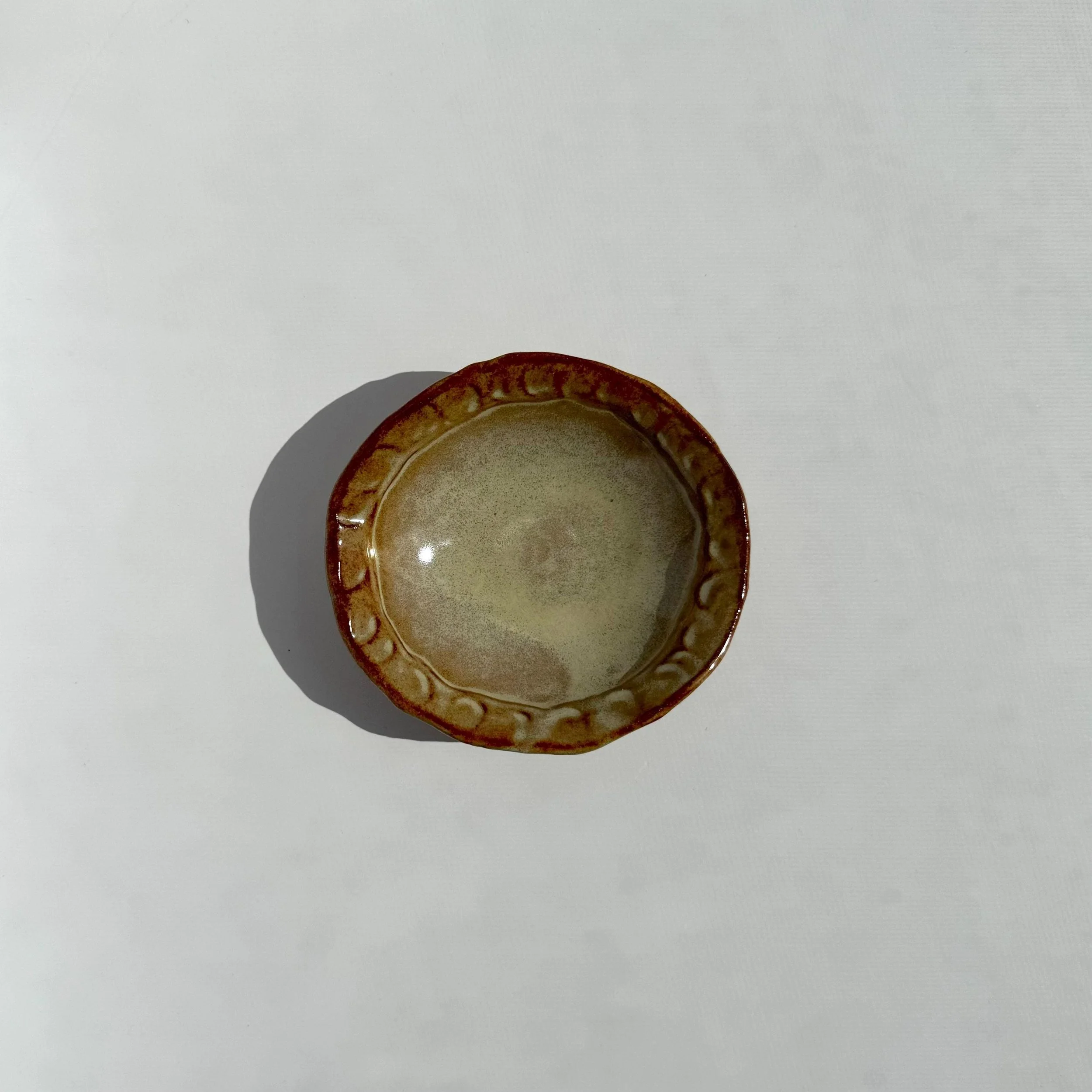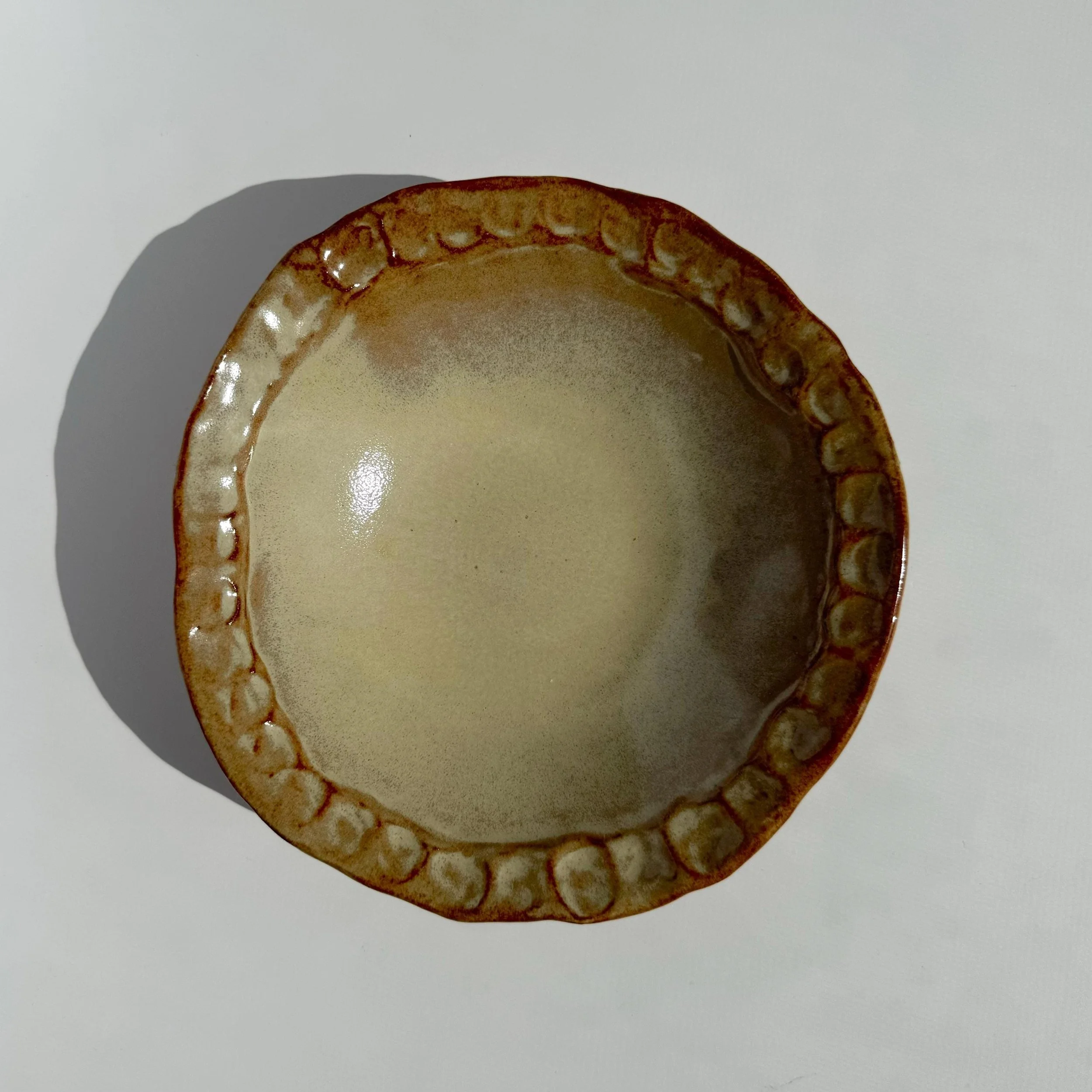 Hand-thrown, white stoneware with a hand-carved, tricolor glazed rim