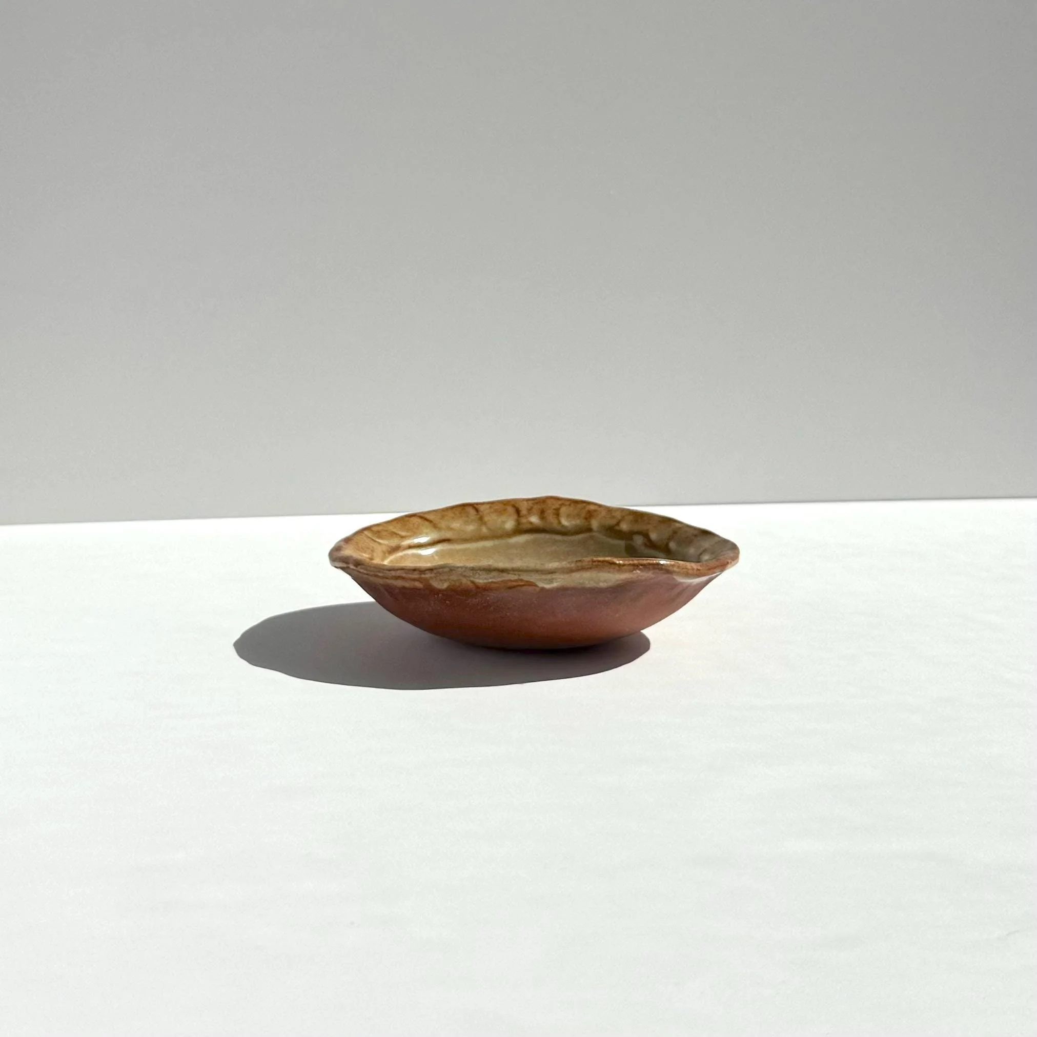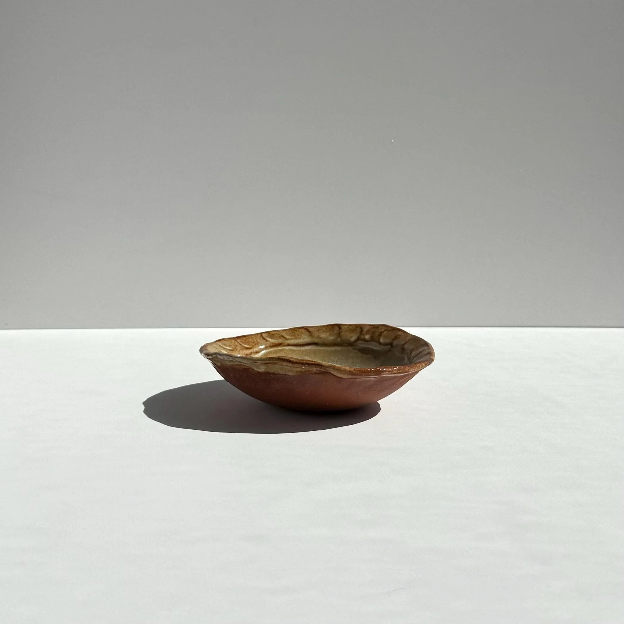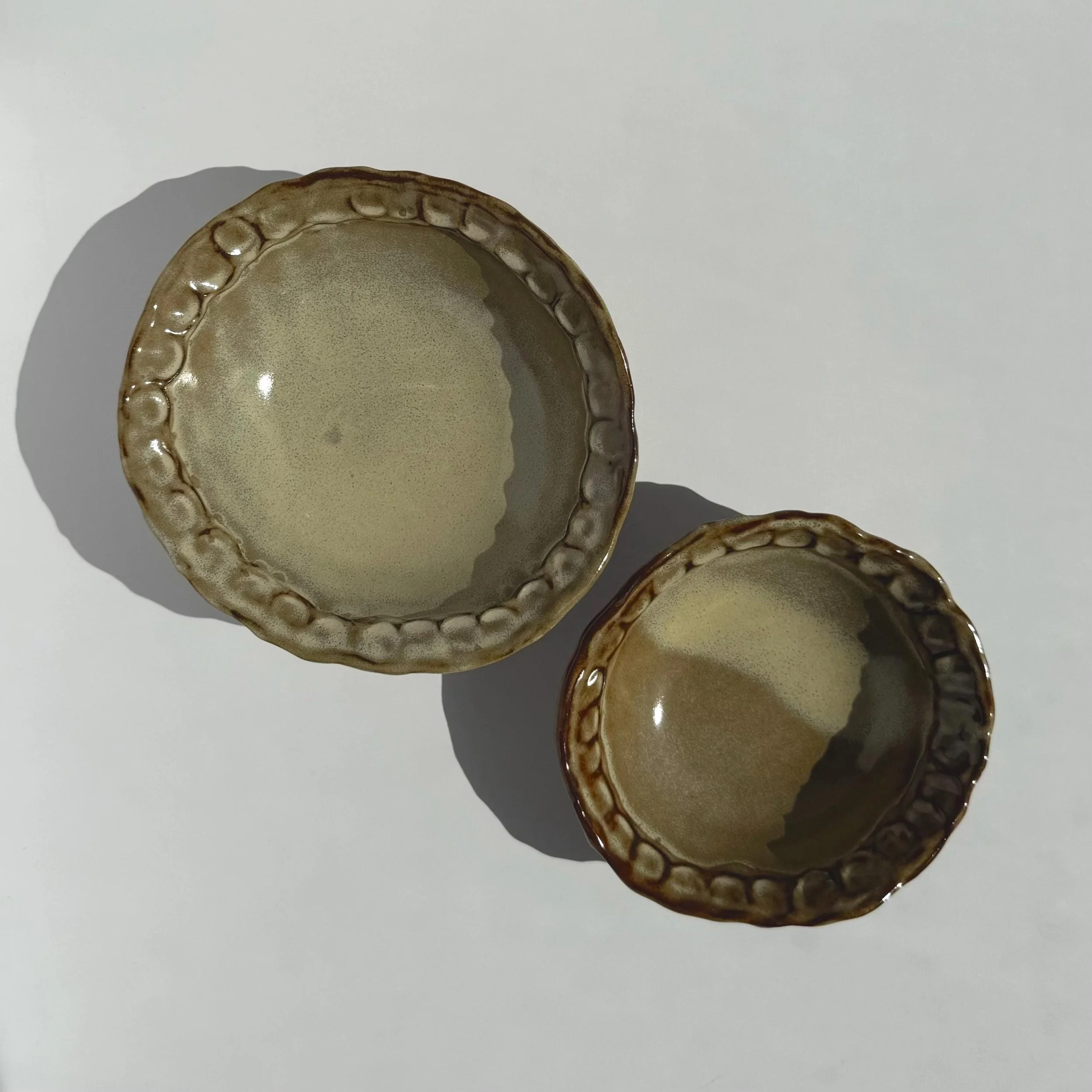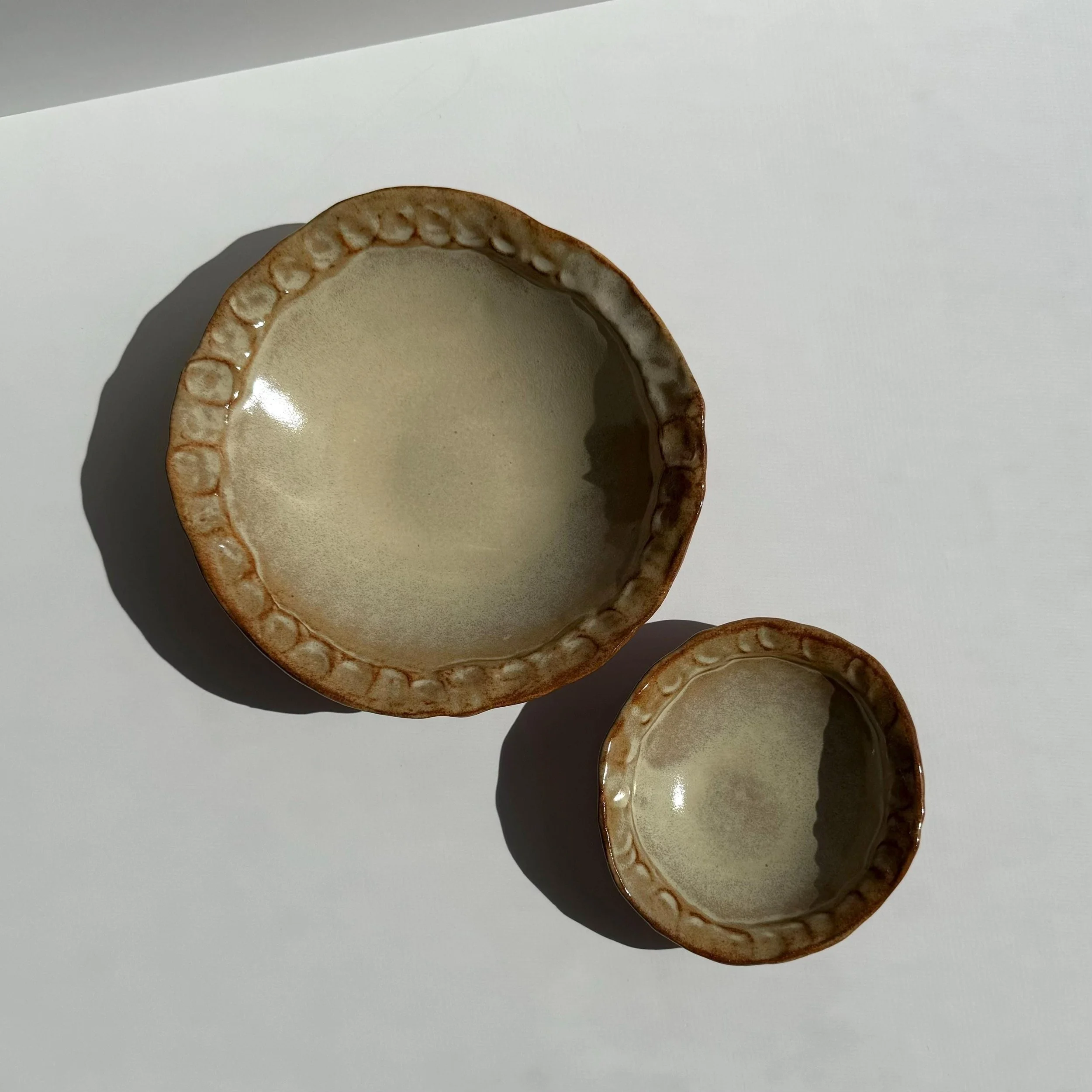 Hand-thrown, white stoneware with a hand-carved, tricolor glazed rim